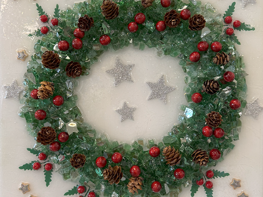 Holiday themed crushed glass, mixed media with resin on 12″ x 12″ board.